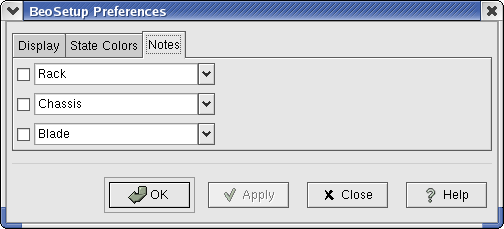 Check any combination of the boxes to indicate which of the notes should be visible to cluster users. Three default values (Rack, Chassis, or Blade) are available through the dropdown menus; you can also enter a note directly in the fields.