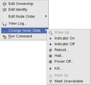 Keep in mind that these states only indicate the condition of the node as reported by the BProc daemons. In turn, the BProc daemons are only capable of determining a node's state based on the messages communicated (or not communicated, as the case may be) between a node and the master. For example, just because a node's state is not listed as error doesn't mean there isn't some undetected hardware problem occurring within the node. These states are only indicative of how the BProc software sees the node. A pop-up menu is available in this list box with options for taking nodes on and off-line.